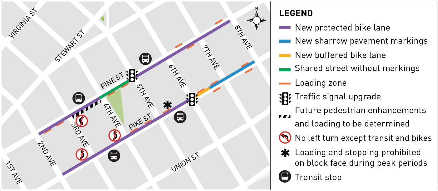 *Note: this map represents the project design. During September 2017 installation, new bike facilities were installed on Pine St between 3rd Ave and 6th Ave, and on Pike St between 2nd and 8th Ave.