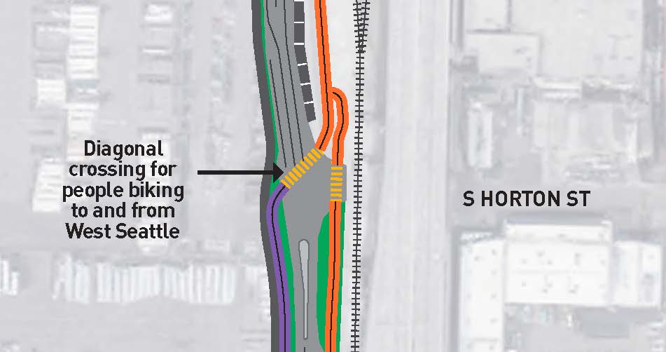 - New diagonal crossing with signal for bike traffic at S Horton St