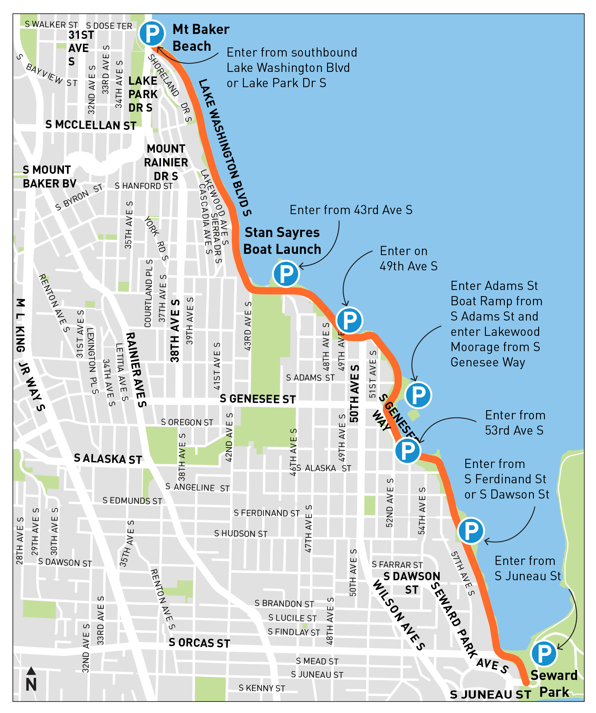 - Starting 4th of July weekend, 3 miles of Lake Washington Blvd (from Mt Baker Park to Seward Park) will open to people walking, rolling, and biking on weekends & holidays through at least September (June 2021)