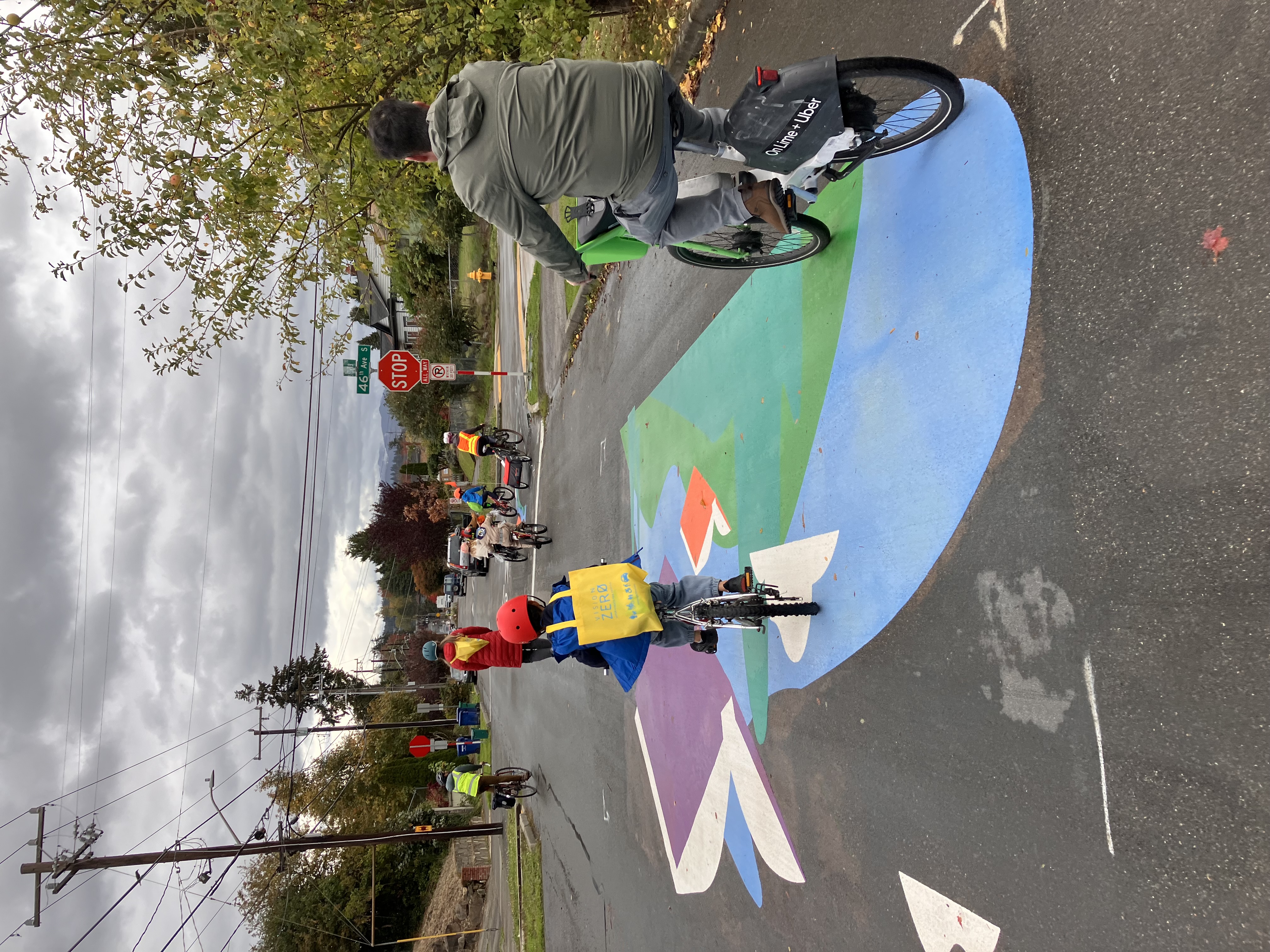 Adults and kids ride their bikes on the Othello Healthy Street at the new S Kenyon St mural