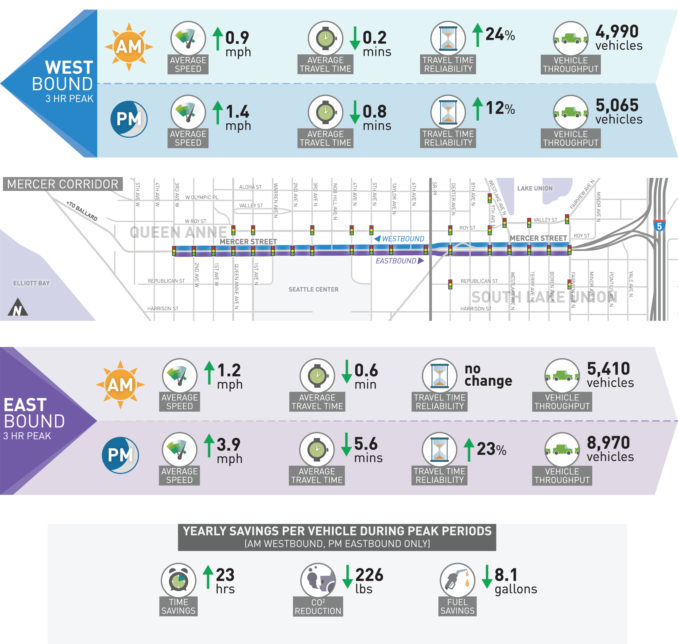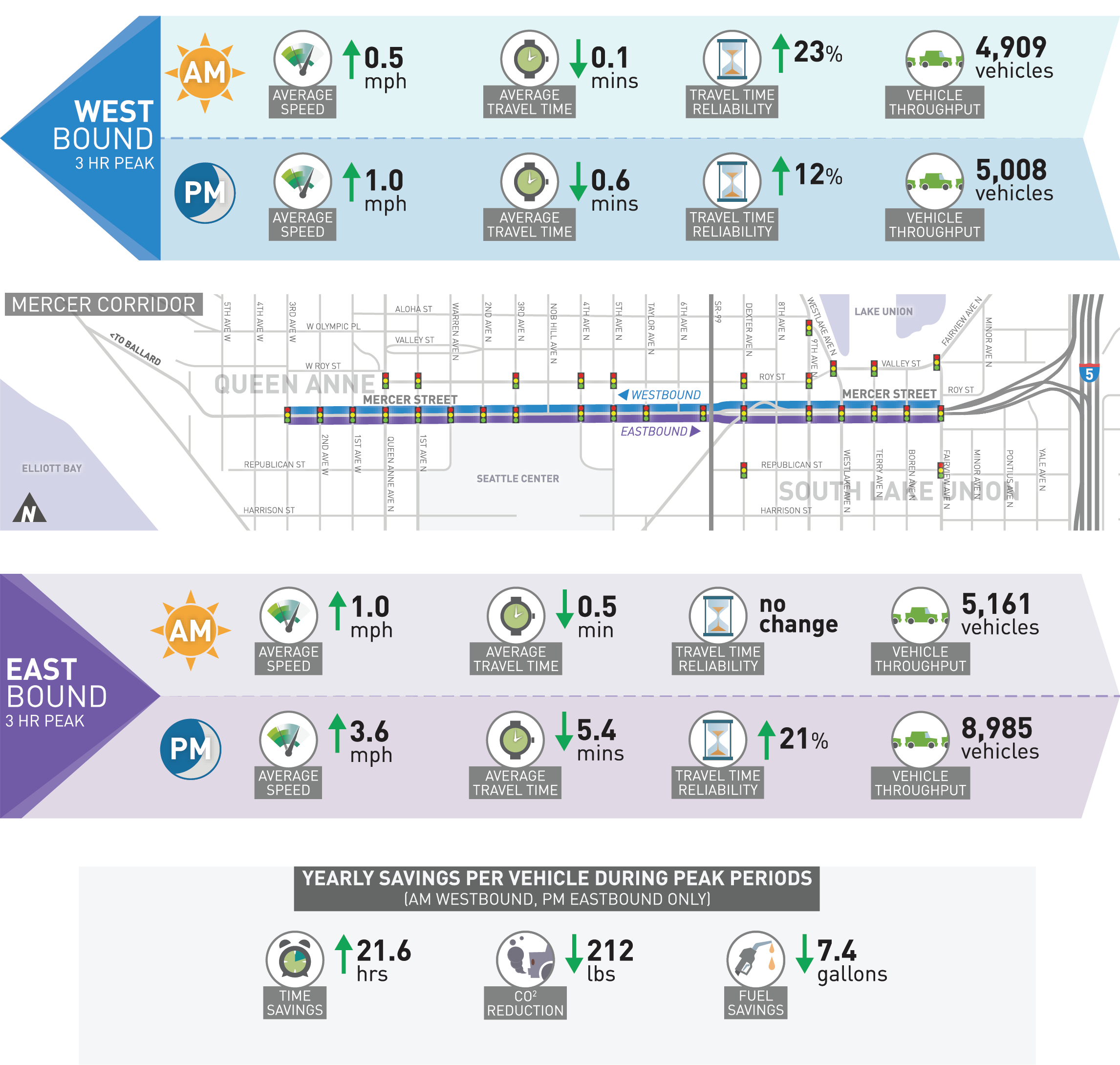 To assess the how well SCOOT is working, vehicle data is being collected daily and compared to historical averages. Reporting periods include morning and evening peak travel times (3 hours) in both the eastbound and westbound directions during the 5-day work week. These periods are when traffic volumes are at their highest. From the data received to date, the following changes have occurred.