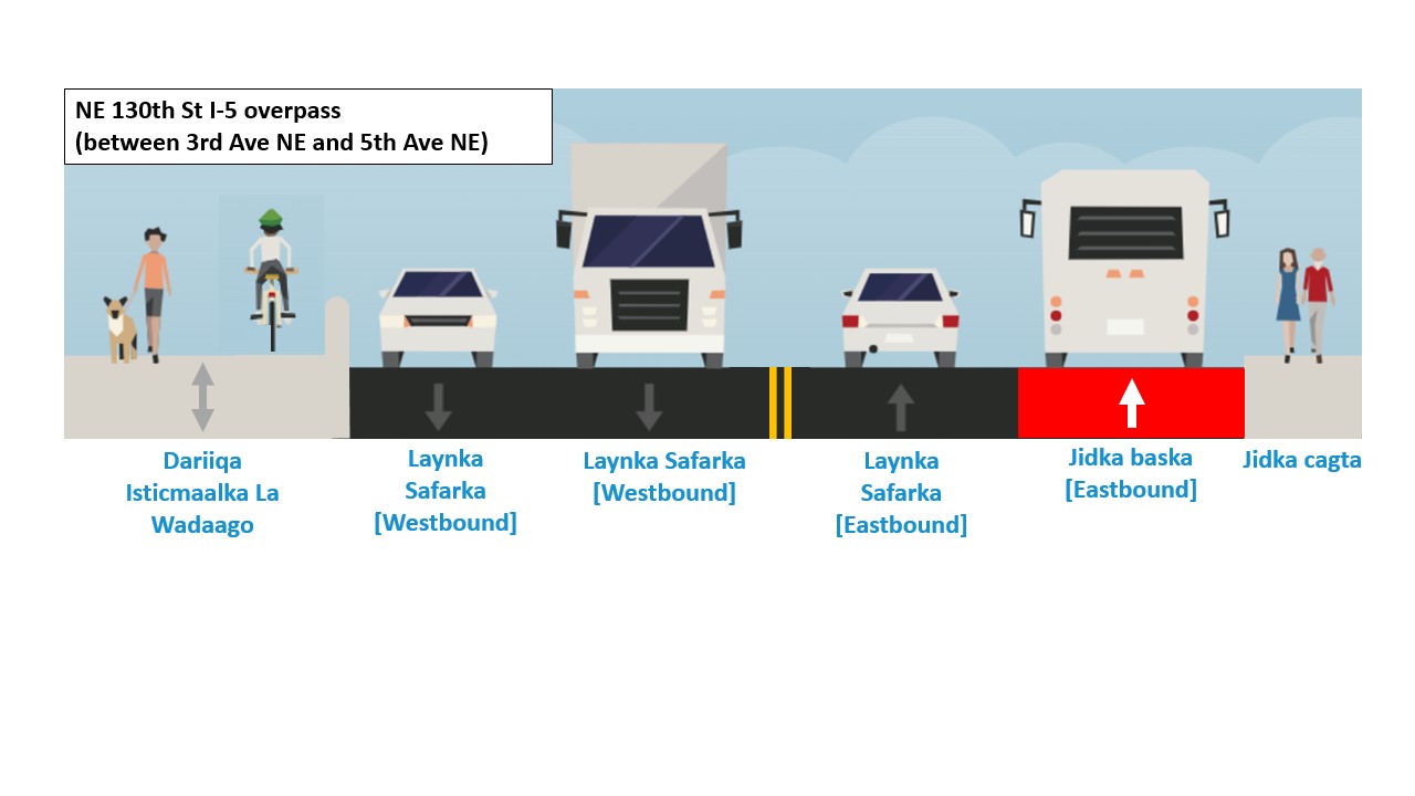 Ma jiro leexasho bidix oo bari u socda laga bilaabo NE 130th St oo u socda woqooyiga 5th Ave NE si loo hagaajiyo gelitaanka saldhigga iyo socodka taraafikada