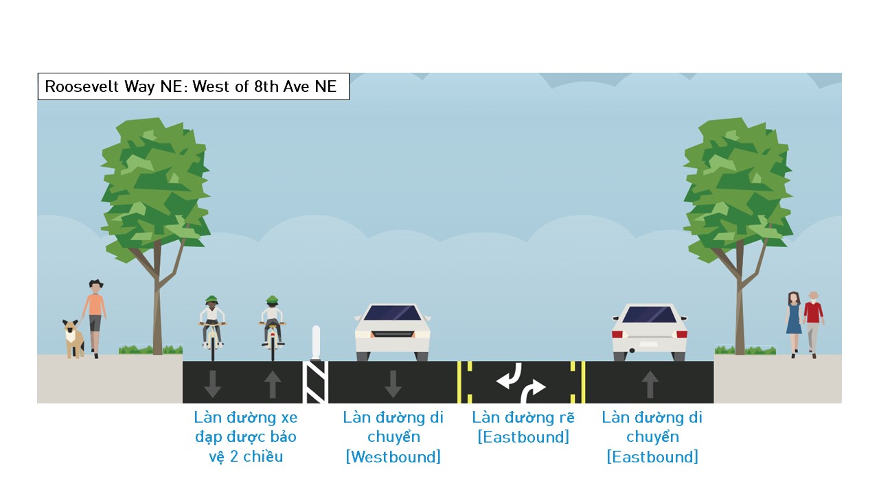 Làn đường xe đạp hai chiều được bảo vệ (chuyển sang làn đường xe đạp một chiều ở phía đông của đường 8th Ave NE)