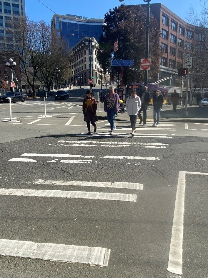We initially wanted to test the efficacy of traffic control and separating pedestrians and cyclists from car traffic. So we installed paint and posts to remove a northbound travel lane on 3rd Ave across Yesler Way. We also removed the right-turn slip lane from southbound 3rd Ave to Yesler Way. The paint and posts we used created temporary curb bulbs at street corners where pedestrians cross the street. Lastly, the project revised parking near the intersection and connected the Yesler Way’s protected bike lane to 4th Ave S along Dilling Way. In collaboration with King County Metro, we were able to monitor bus traffic and found that buses traveled efficiently with these changes. Based on the success of the pilot project, we are recommending permanent improvements.