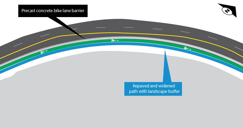 - Adding a concrete barrier to give people walking and biking more space and separation from traffic