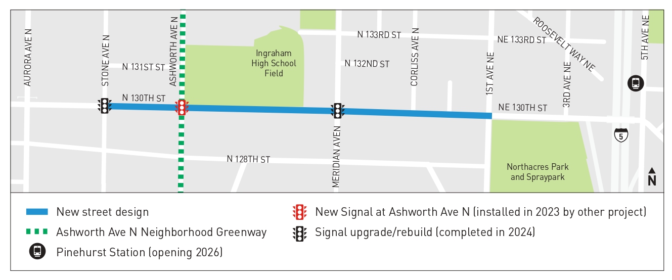 - Adding ‘No Turn On Red’ restrictions at 1st Ave NE, Meridian Ave N, Ashworth Ave N, and Stone Ave N to improve pedestrian, bicycle and overall operational safety