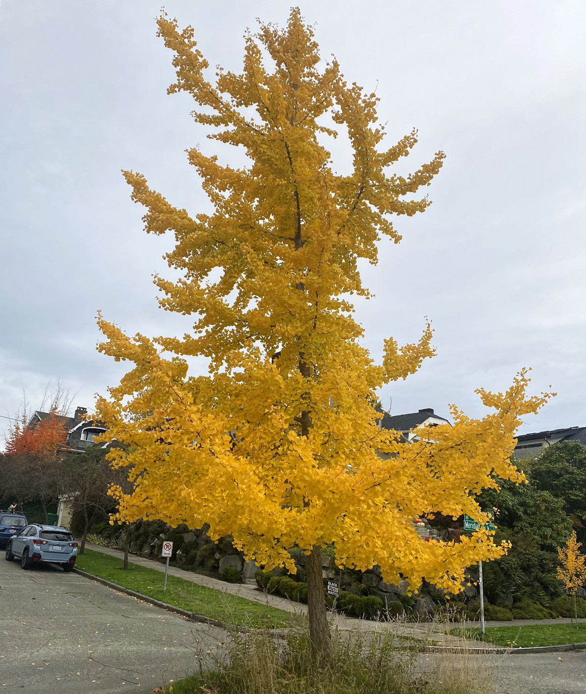 Iconic fan shaped leaves with a scalloped margin are a medium green in summer and a beautiful gold in fall. The leaves look similar to the leaflets on maidenhair fern thus, the other common name for ginkgo is maidenhair tree.