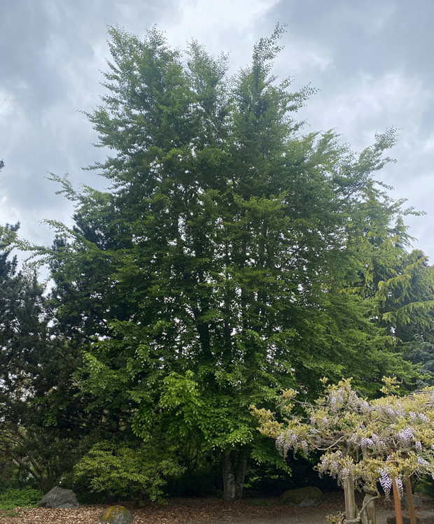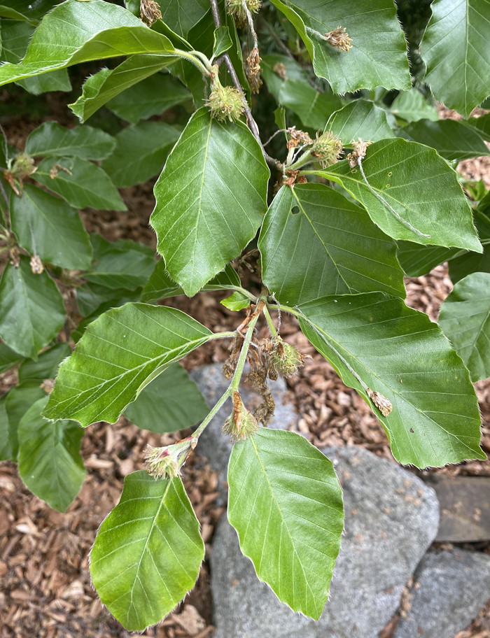 This stately tree is upright when young and becomes rounded with age. It has rich, glossy green leaves with wavy margins that turn golden brown in the fall. The smooth bark looks like an elephant hide and is maintained into maturity.