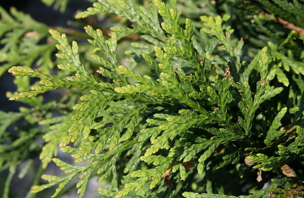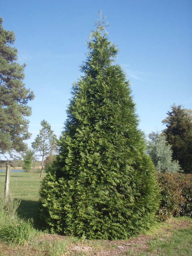 A cross between our native Western red cedar and Japanese arborvitae. Dense and pyramidal, it is great for screening. No hedge trimmers needed. It is tolerant of damp soils.