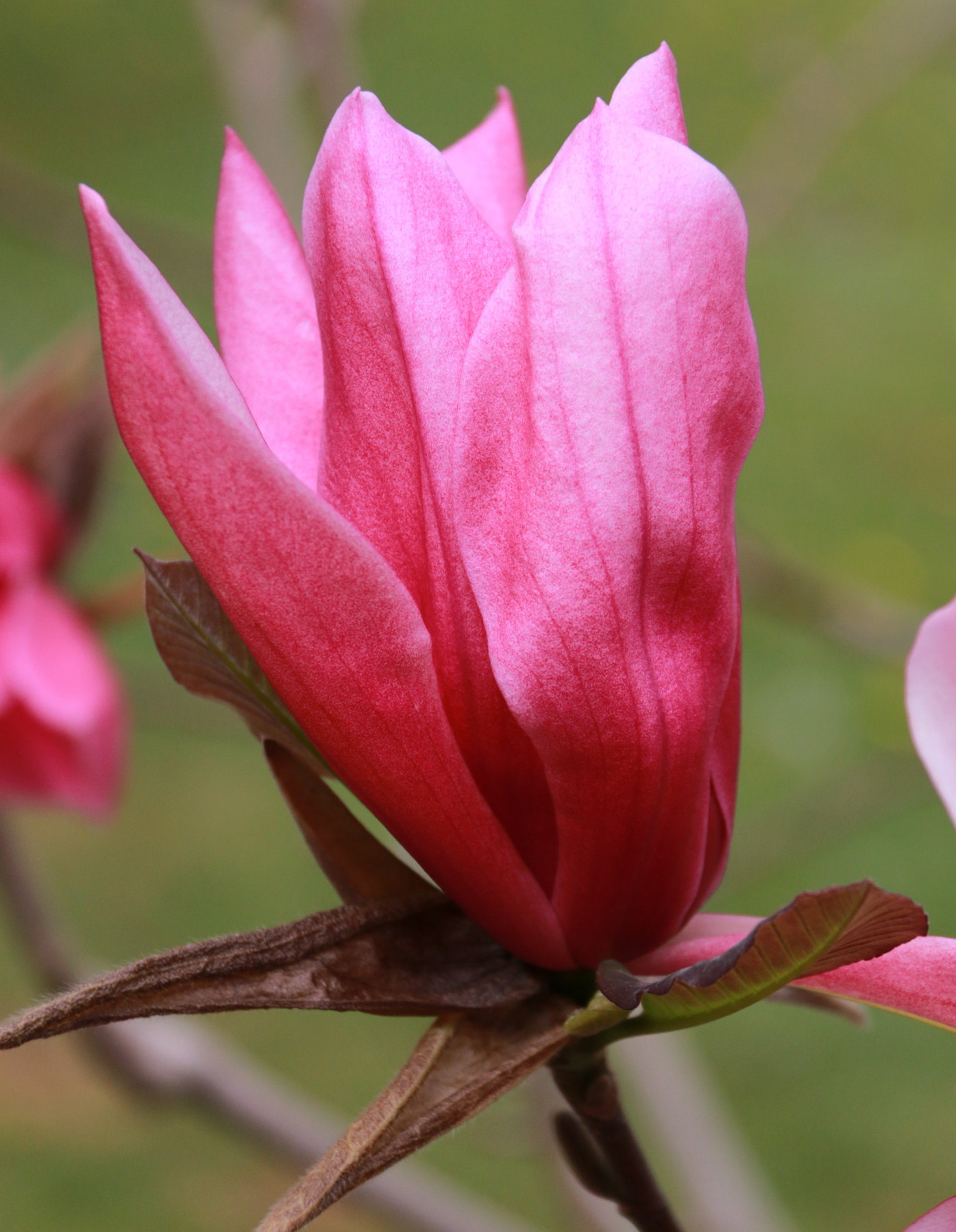 A beautiful street or yard tree with a strong central leader and upright form that works well under power lines. The deep pink flower buds open to large fragrant light pink flowers a month later than other saucer magnolias.