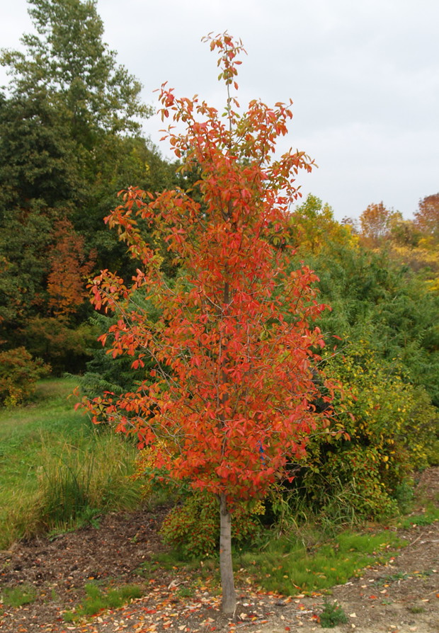 A straight central leader and columnar form along with its pest resistance make this tree a reliable performer. The beauty of its glossy green summer foliage gives way to a spectrum of fall color from yellow to red. This is a femaile cultivar that produces a small dark blue fruit that is enjoyed by birds.
