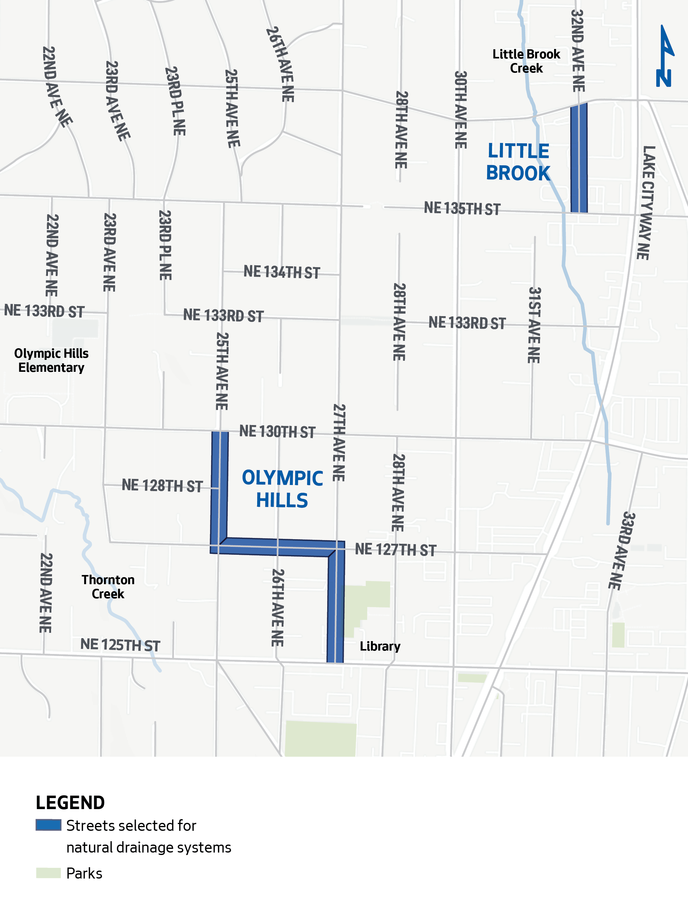 Map showing selected project locations for natural drainage systems on 32nd Ave NE between NE 135th St and NE 137th St, on 25th Ave NE between NE 127th St and NE 130th St, on NE 127th St between 25th Ave NE and 27th Ave NE, and on 27th Ave NE between NE 125th St and NE 127th St.