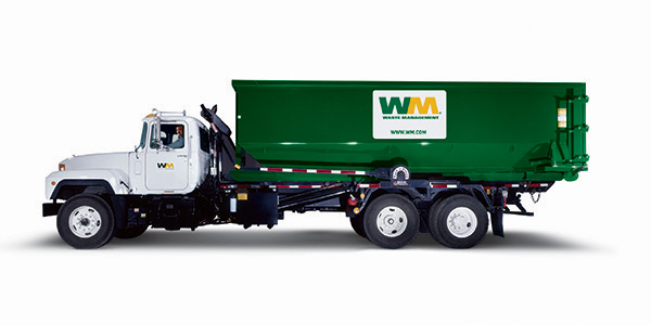 Roll-off trucks service the larger metal containers typically used in large commercial, multi-family, and mixed-use buildings. They require 14 feet of overhead clearance to service. The truck backs up to a container, lifts it onto the bed of the truck, and drives the container to the transfer station or recycle facility to dump the materials. The driver then returns the container to the property.
