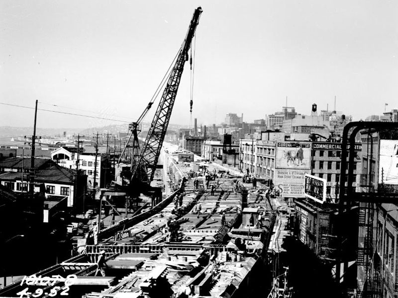 In 2019, the Washington State Department of Transportation completed the removal of the Alaskan Way Viaduct which ran between S King and Battery streets. Damaged by the February 2001 Nisqually earthquake, the 1950’s era, double-decker viaduct was a highway that divided the central business district and downtown from the waterfront. The highway was noisy, added roadway debris, impacted views, and blocked sunlight.