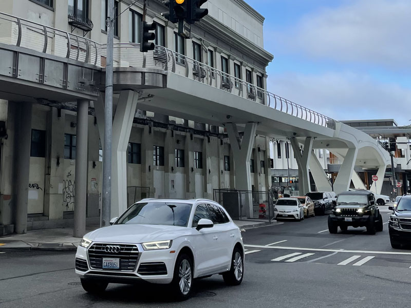 The Marion Street Pedestrian Bridge provides an essential connection to the Seattle Multimodal Terminal at Colman Dock, which serves nearly 5 million pedestrian passengers annually. In addition to the Washington State Ferries which operate from Coleman Dock, the bridge provides access to Pier 48 water taxi / fast ferry passenger services, making it one of the busiest pedestrian bridges on the west coast. In 2019, the Washington State Department of Transportation (WSDOT) constructed a temporary pedestrian bridge that maintained grade separated pedestrian access during the redevelopment of the Coleman Dock and Alaskan Way following demolition of the SR-99 viaduct.
