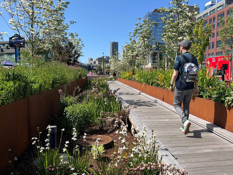 The park promenade is at the front porch of the new waterfront — providing a new linear park between Pioneer Square to the Seattle Aquarium and improving access to Seattle Ferry Terminal at Colman Dock and all the activities on the waterfront. The promenade joins the Overlook Walk on the north end and the rebuilt Railroad Way pedestrian plaza on the south end, providing access to the historic Pike Place Market and Pioneer Square neighborhoods.